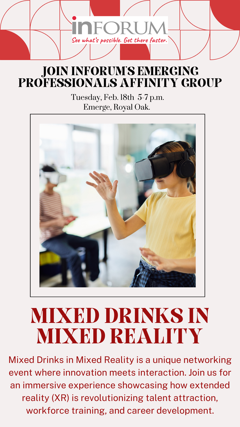 We are very excited for the next Emerging Professionals Affinity Group meeting taking place at Emerge in Royal Oak on Feb. 18 from 5-7 p.m. You can register for this free event by clicking here! Emerge will have drinks, networking, and VR sets for all of us!